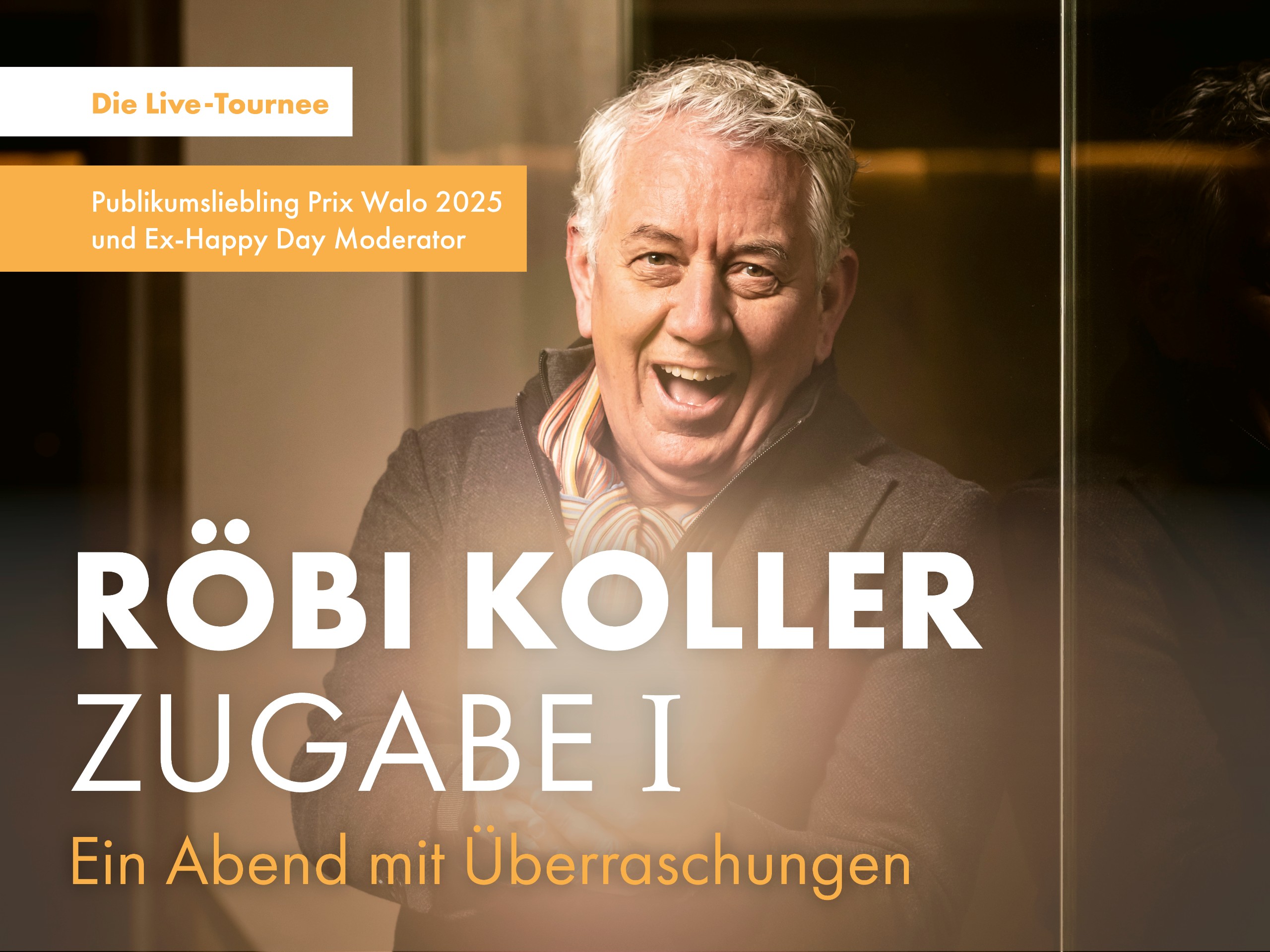 Man kennt ihn aus dem Fernsehen. Man hat mit ihm geweint, gelacht – manchmal sogar beides gleichzeitig. Und jetzt ist er zurück. Röbi Koller betritt erneut die Bühne – diesmal solo. Ohne Studiokameras, aber mit einem Sack voll Geschichten, Sprachwitz und vielen Überraschungen. Röbi Koller, die Happy-Day-Ikone und diesjähriger Prix-Walo-Publikumsliebling, präsentiert sein erstes Bühnenprogramm: «Zugabe – Ein Abend mit Überraschungen.»