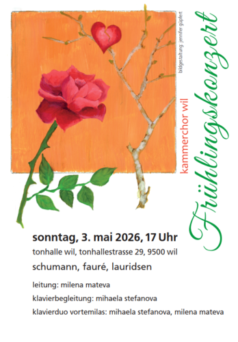 Auf dem Programm stehen zwei Liederzyklen sowie ein instrumentales Musikstück. Die Dichterliebe op. 48 von Robert Schumann dürfte vielen bekannt sein. Das Stück wird in einer Bearbeitung für Chor und Klavier von Hye-Young Cho, einer Südkoreanerin, aufgeführt. «Les chansons des roses» sind Gedichte von Rainer Maria Rilke, die Morten Lauridsen vertont hat.